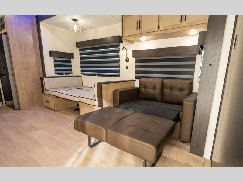 You will always find a comfortable place to relax with friends and family, cook with the full kitchen amenities, and clean up daily in the bathroom. There are also cozy sleeping spaces, plenty of storage options, and durable construction materials so you can enjoy your trailer for years to come!